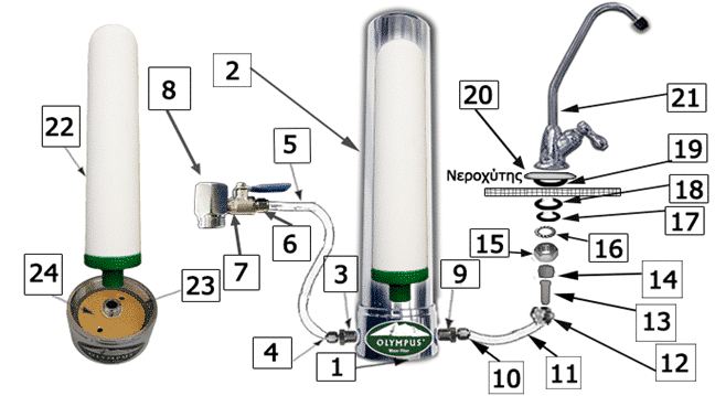 Το φίλτρο πρέπει να τοποθετηθεί όρθιο κάτω από τον νεροχύτη, κοντά στην παροχή του νερού και το βρυσάκι του τοποθετείται στην επιθυμητή θέση πάνω στο νεροχύτη. Το σωληνάκι των 2 μέτρων που περιέχεται στη συσκευασία, κόψτε το σε 2 κομμάτια που το μέγεθός τους να σας επιτρέπει κατά την αλλαγή του φίλτρου να τραβάτε τη συσκευή έξω από το ντουλάπι. (Αν το σωληνάκι κοπεί λοξά θα έχετε διαρροή)