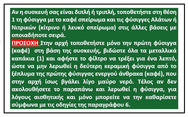 – Βιδώστε καλά το μεταλλικό καπάκι της συσκευής (2) στη βάση του. Τώρα ανοίξτε τη βρύση και από το βρυσάκι του φίλτρου, την πρώτη φορά, ίσως βγει λίγο μαύρο νερό από το ξέπλυμα του ενεργού άνθρακα.3. ΠΡΟΣΟΧΗ: Την πρώτη φορά και κάθε φορά που αλλάζετε φύσιγγα, αφήστε το νερό να τρέξει για 10 λεπτά. Μην χρησιμοποιείται το φίλτρο για 24 ώρες. Μετά τις 24 ώρες αφήστε να τρέξει για 2-3 λεπτά και το φίλτρο είναι έτοιμο για χρήση. Επίσης, αν το φίλτρο μείνει αχρησιμοποίητο για πάνω από 3 ημέρες, αφήστε το νερό να τρέξει για 2-3 λεπτά.